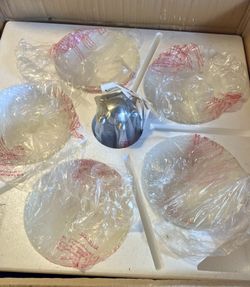 Hampton Bay 5-Light Brushed Nickel Chandelier with Etched Clear Glass Shades. This chandelier is new in its original, distressed packaging$40El Cajon, CA