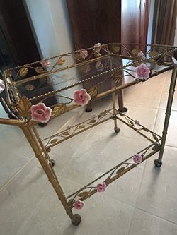 Antique Gold Leaf Tea Cart With Original Ceramic Flowers$350Fort Lauderdale, FL