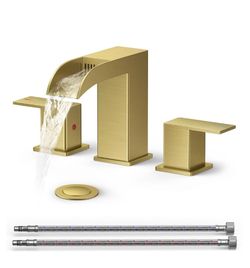QFN Brushed Gold Bathroom Faucet 3 Hole, 8 Inch Widespread Square Sink Faucet Bathroom with Metal Pop-up Drain and 24" CUPC Supply Line, Lead-Free 2 H$79Downey, CA