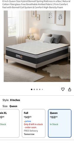 8 Inch Queen Size Hybrid Bonnell Spring Mattress in a Box | Natural Cotton Fiberglass-Free Breathable Knitted Fabric | Firm Comfort Feel with Bonnell $150Menifee, CA