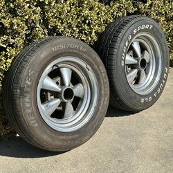 73 74 Chevy Nova 350 Classic Z28 Wheels 14” Rims Tires pair 2 good condition 1973 thru 1974 Chevrolet SS 5 lug 14 Inch Restored Clean Original Only 2$150Montclair, CA