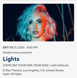 Lights SOLD OUT Concert Show El Rey Theatre Los Angeles 02/21/2026$75Huntington Beach, CA