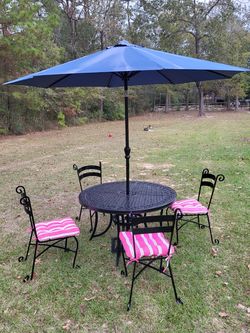 4 wrought iron patio chairs with aluminum table, umbrella & stand plus 4 Cushions 11 pieces$350Splendora, TX
