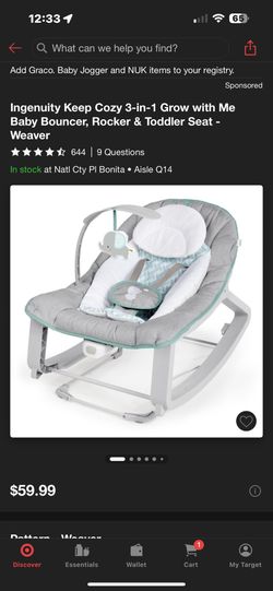 Ingenuity Keep Cozy 3-in-1 Grow with Me Baby Bouncer, Rocker & Toddler Seat $20Escondido, CA
