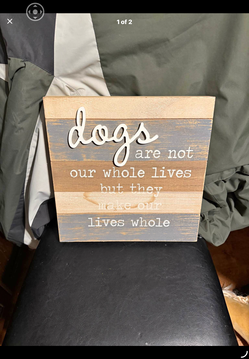 This Hobby Lobby "Dogs Make Our Lives Whole" Wood Wall Decor is a square MDF sign featuring a planked background with rustic gray and brown tones. Me$10South Bend, IN