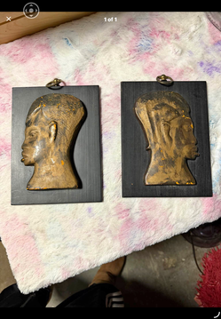 This item is a pair of vintage hand-carved African wall plaques depicting profiles of human heads on wooden backings.$20South Bend, IN