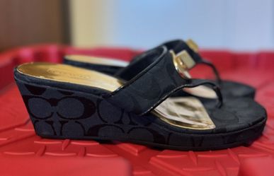 Coach signature wedge thong sandals featuring black logo fabric and gold-tone hardware. Size 7$45La Habra Heights, CA