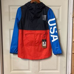 $90 Women’s The North Face IC Anorak Rain Jacket USA Olympics Hooded Water Resistant Windbreaker Jacket in the Fiery Red Blue White Colorway $39Hampton Falls, NH