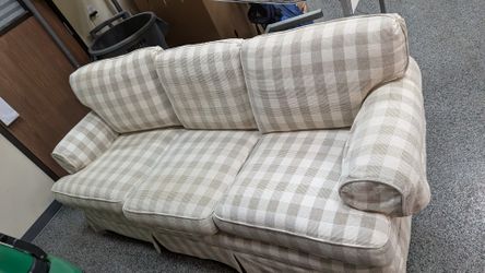Tan And White Check Fabric Couch With Matching Arm Chair $125 . City Of Orange 🍊 Come With Extra Fabric. $125Anaheim, CA