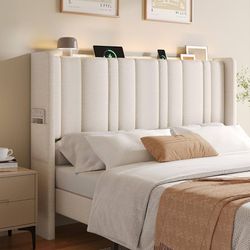 Queen Size Headboard with Storage, LED Light, Linen Vertical Wingback Headboard with Charging Station, Upholstered Head Board Queen w/High-Density Spo$100Katy, TX