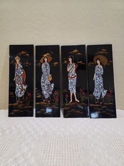 Vintage Signed 4 Panel Asian Wood Hand Painted Abalone Shell Art Pictures *Please Read Entire Description*$200Goodyear, AZ