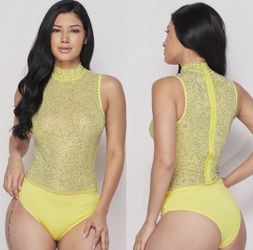 "Bling" Mesh Jeweled Mock Neck Bodysuit - Yellow$39Los Angeles, CA