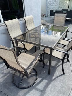 Outdoor Patio Tempered Frosted Glass NEW Table With 6 Outdoor Patio Aluminum Stackable NEW Chairs $340Miramar, FL