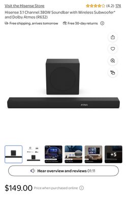 Hisense 3.1 Channel 380W Soundbar with Wireless Subwoofer* and Dolby Atmos (R632)$60Irving, TX