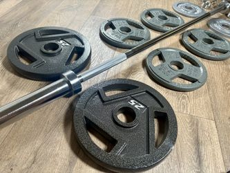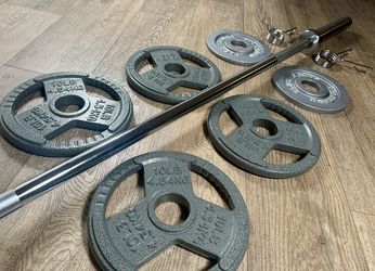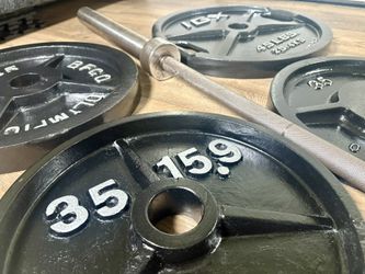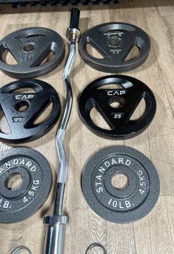 Olympic Equipment: Silver Curl Bar With Cooper Bearings & Weight Plates Pairs Of 35s, 25s And 10 Pounds (Total: 160 lbs)$236Los Angeles, CA