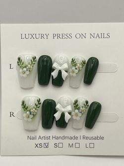 Handmade Reusable Press On Nails Green White Bow Flower Decor - X SMALL$20Pasadena, CA