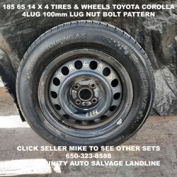 185 65 14 X 4 Tires & Wheels Off Toyota Corolla With 4lug 100mm Lug Nut Bolt Pattern. $200Palo Alto, CA