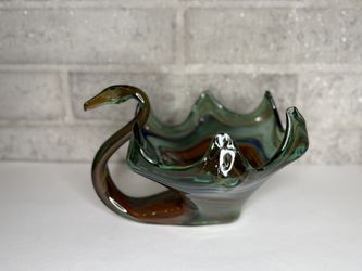 Vintage Art Glass Swan Bowl Ruffled Rim Green Amber Blue Swirl Centerpiece$60Phoenix, AZ