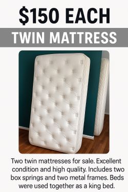 TWIN MATTRESSES FOR SALE – $150 EACH (or $280 for both) Condition: Excellent | Includes: Box spring$150Miami Beach, FL