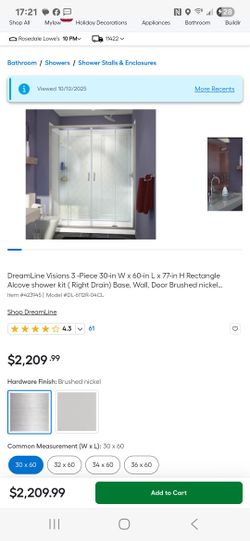 DreamLine Visions 3 -Piece 30-in W x 60-in L x 77-in H Rectangle Alcove shower kit ( Right Drain) Base, Wall, Door Brushed nickel Hardware Included