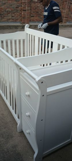 Solid wood white baby crib with attached changing table, featuring 3 drawers and 3 shelves.$200Plano, TX