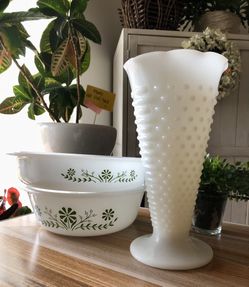 Milk Glass Hobnail Vase & Glasbake Bowls$20Lower Paxton Township, PA