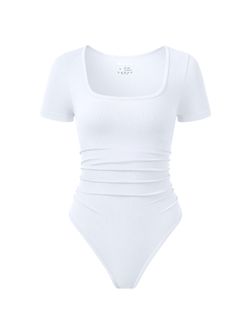 OQQ Women Bodysuits Ruched Short Sleeve Square Neck Stretch Lounge Travel Bodysuits White M$15Avondale, AZ