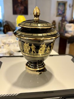 Black & Gold Neoclassical Porcelain Urn with Lid β Greek Key Design $80Miami, FL