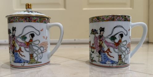 New Chinese Porcelain Mug Set with Lid - Hand-Painted Figures & Landscape (2-Piece)$30Boca Raton, FL