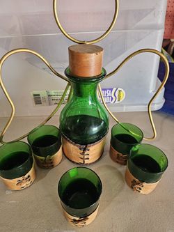 Vintage Green Glass Leather Wrapped Decanter With 6 Matching Glasses$19Santa Monica, CA