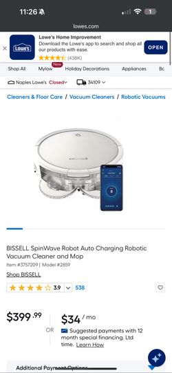 BISSELL SpinWave Robot Auto Charging Robotic Vacuum Cleaner and Mop$275Naples, FL