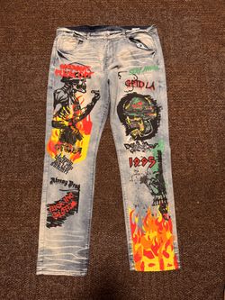 Men's Light Blue Graphic Print Straight Jeans Flames Skull Street Art 1990s$20Turlock, CA