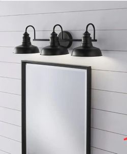 Elmcroft 29 in. 3-Light Matte Black Modern Farmhouse Bathroom Vanity Light with Metal Shades