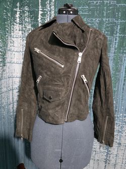 AllSaints suede biker jacket, likely the Balfern or Dalby model, featuring a slim fit, metal hardware, and an asymmetrical front zip. # Y$350Placentia, CA