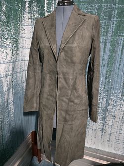 ALICE + OLIVIA SUEDE LEATHER COAT IS A CHARCOAL LONG-SLEEVED GARMENT FEATURING A COLLARED DESIGN WITH A BUTTON FRONT CLOSURE. SIZE SMALL # Y$800Fullerton, CA