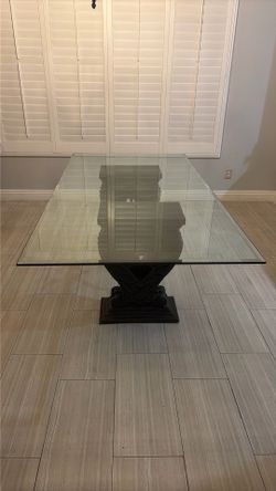 Neoclassical-style Dining Table with a clear glass top and a highly ornamental, black carved base$300Henderson, NV