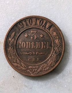1910 Russia 3 Kopeks Copper Coin Czar Nicholas II Empire Imperial Era XF$20Long Beach, CA