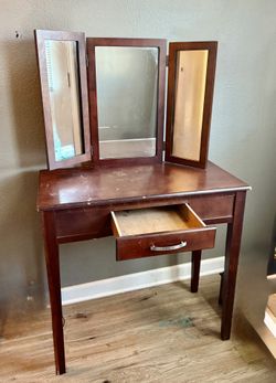 Vintage small, solid wood vanity table with a tri-fold mirror. $45Newport Beach, CA