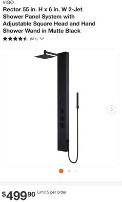 VIGO Rector 55 in. H x 6 in. W 2-Jet Shower Panel System with Adjustable Square Head and Hand Shower Wand in Matte Black$300Victorville, CA