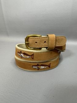 Guy Harvey Fish Webbing Belt Mens 46 Tan Leather Trim Brass Buckle Fishing Belt —show signs of use, please enlarge photos for wear$24Temple, TX