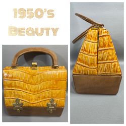 1950s Alligator Crocodile Embossed Purse Yellow Structured Frame Handbag Vtg MCM —-Hardware needs polishing—-$110Temple, TX