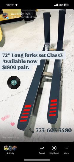 72” Forklift Forks Set Class3. Heavy Duty. For 20” Plate. Like New.$850Crystal Lake, IL