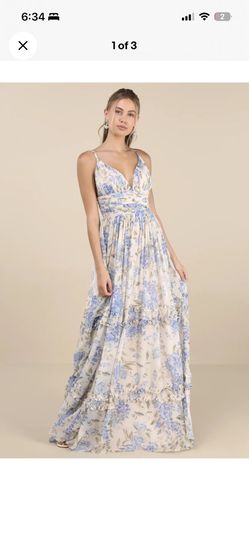 Lulus Women Niora Beige And Blue Floral Pleated Maxi Dress Basic Sleeveless L$40Fontana, CA