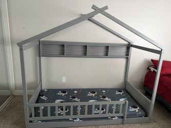 Twin Floor Bed with Storage Shelf, Wooden Bed Frames with Headboard & Guardrail, Montessori Floor Bed with Wooden Slat Support for Kids$180West Covina, CA