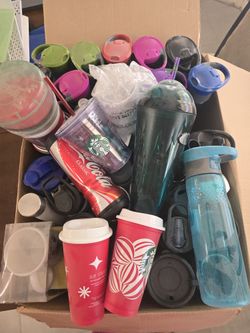 A Box Of Cups, Coffee Mugs, Contigo Water Bottles, Insulated Bottles, Includes 3 Starbucks Cups$15Casa Grande, AZ