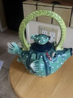 Vintage Blue Sky Clayworks Puffer Fish Teapot and Lid Embossed Ceramic 9-1/2$60Los Angeles, CA