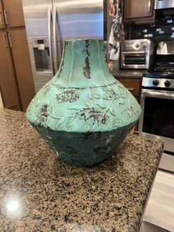 Large decorative turquoise metal vase with an aged patina finish$15Austin, TX