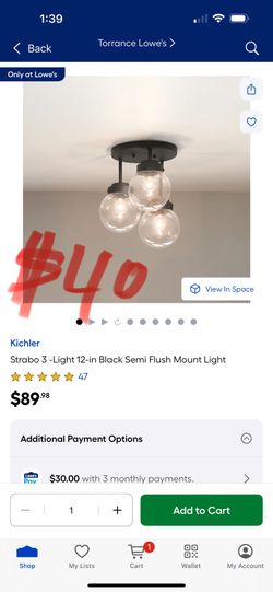 $40 Kichler Strabo 3 -Light 12-in Black Semi Flush Mount Light$40Carson, CA