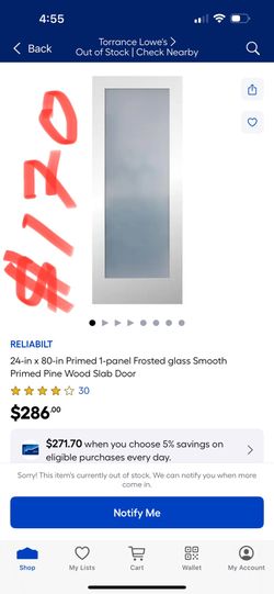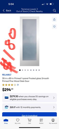 $/80 RELIABILT 30-in x 80-in Primed 1-panel Frosted glass Smooth Primed Pine Wood Slab Door$180Carson, CA