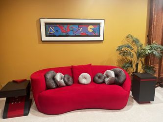 Bold Red Curved Velvet Sofa w/ Pillows And 2 Side Tables – Modern & Stylish$350Vernon Hills, IL